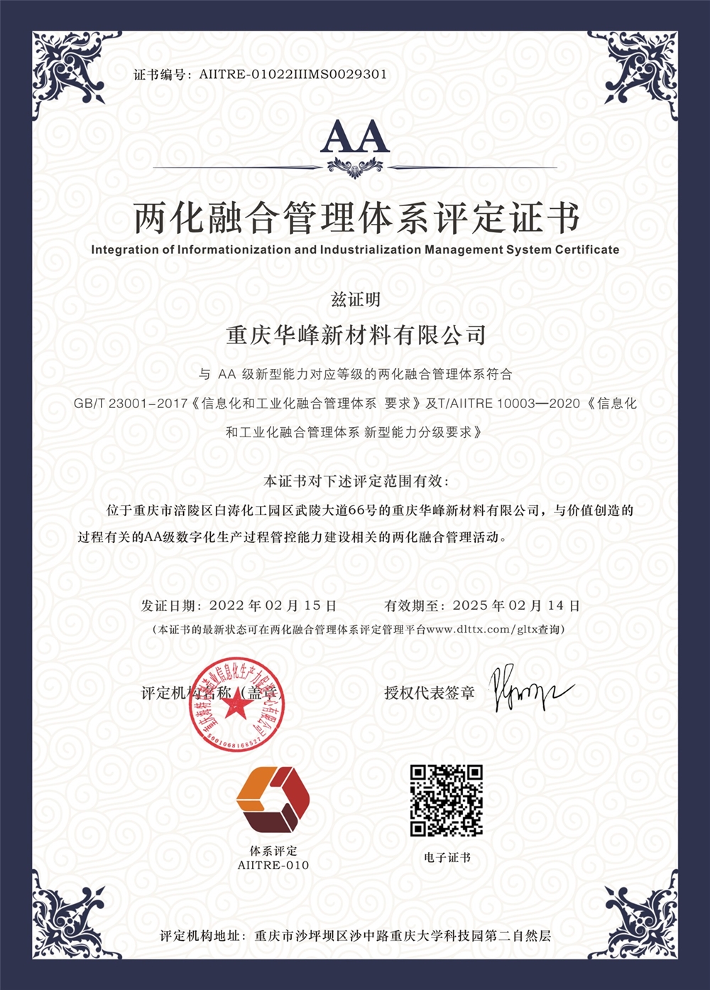 近日,工信部公示了2022年度首批获得“两化融合管理体系”评定的企业名单。经过涪陵区、重庆市两级政府的推荐,以及专业协会的评定和工信部专家组的评审,重庆申博新材料有限公司成功通过“两化融合管理体系”评定。